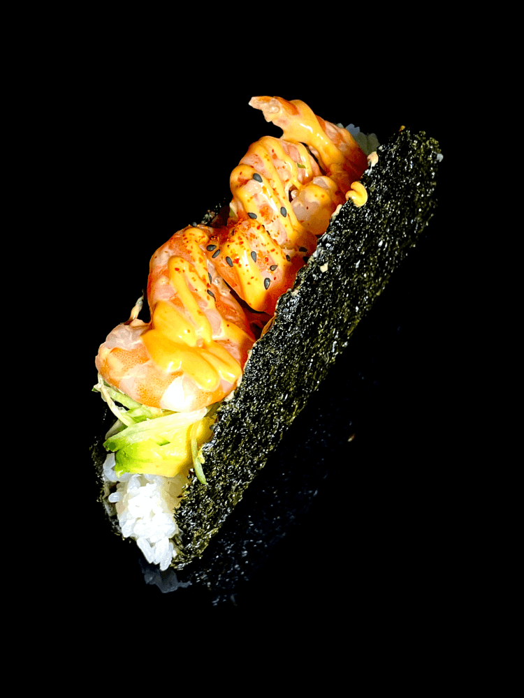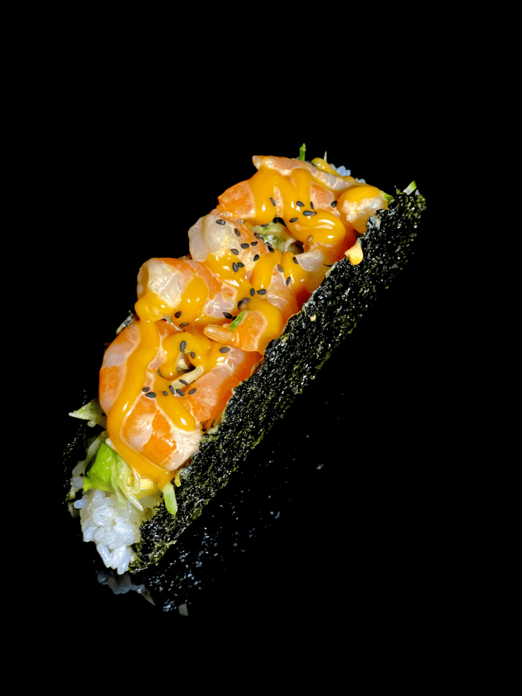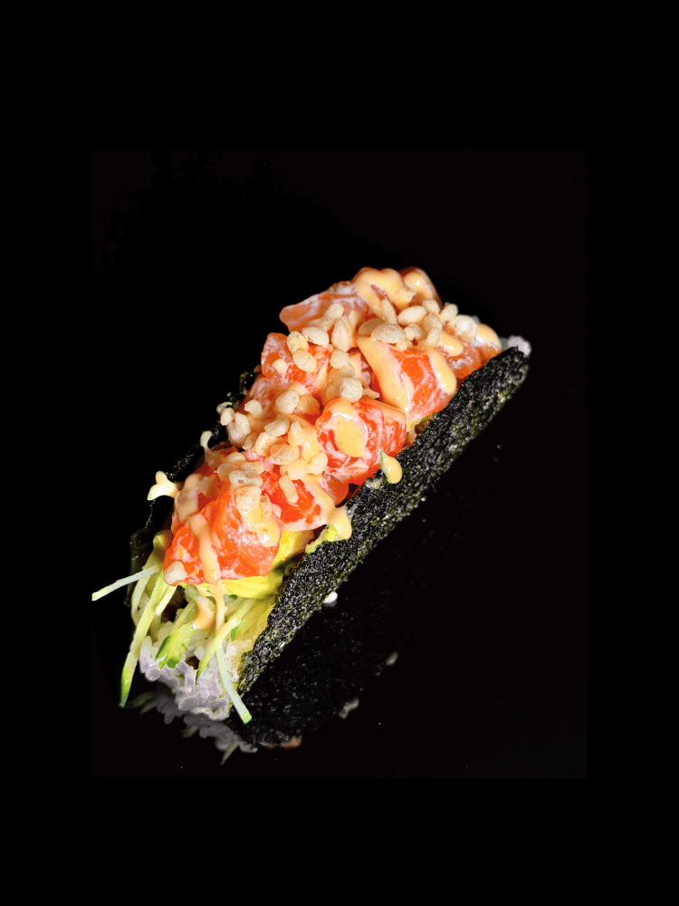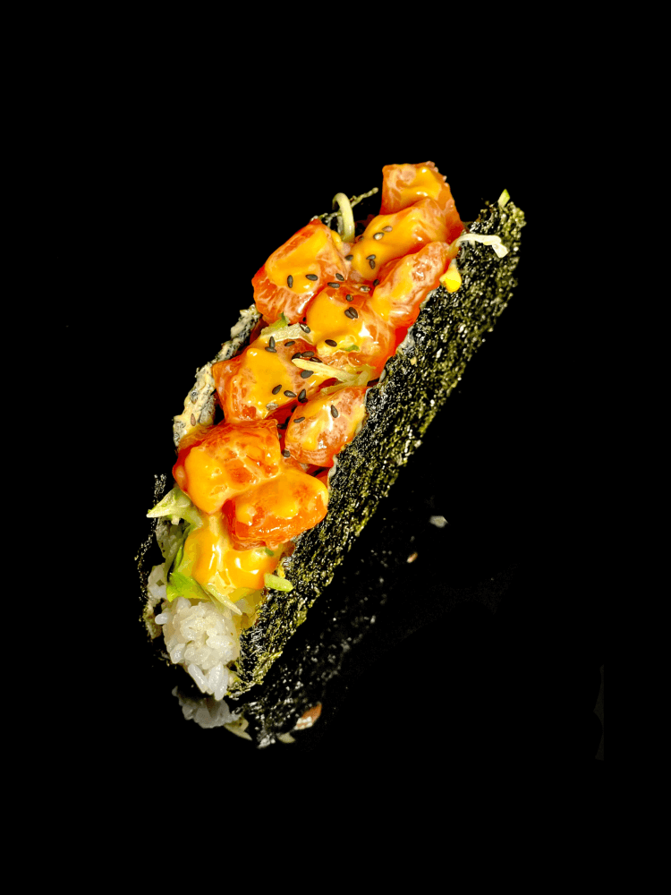 Fresh Salmon with avocado, cucumber, spicy mayonnaise, dried onions, sesame seeds