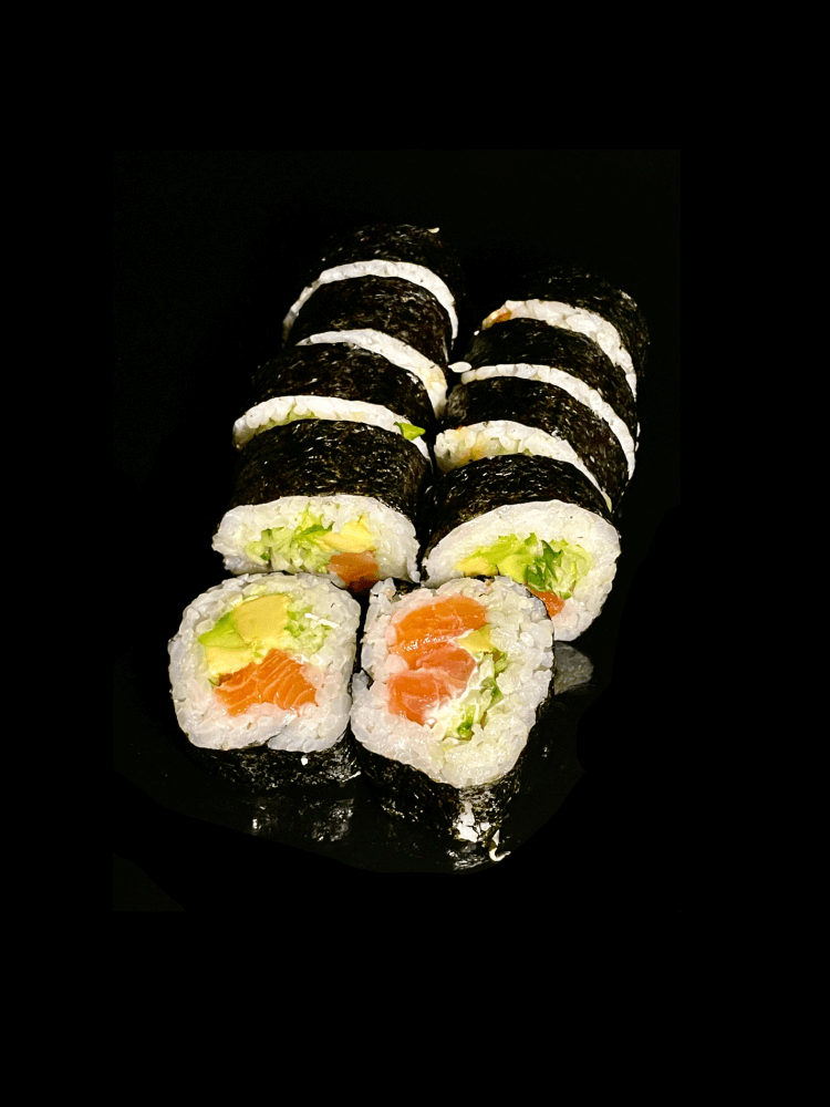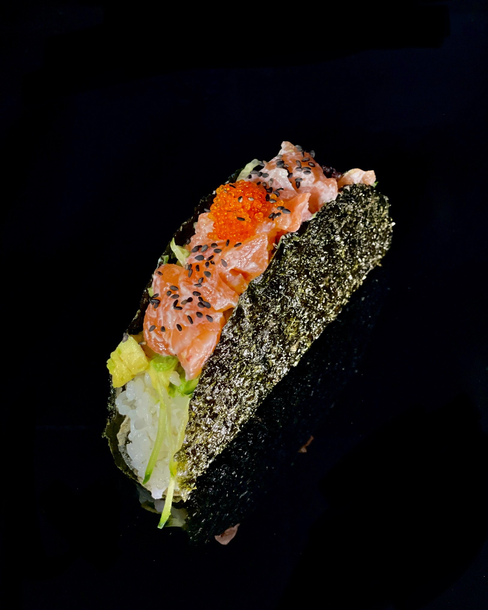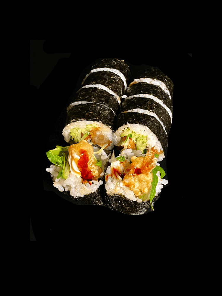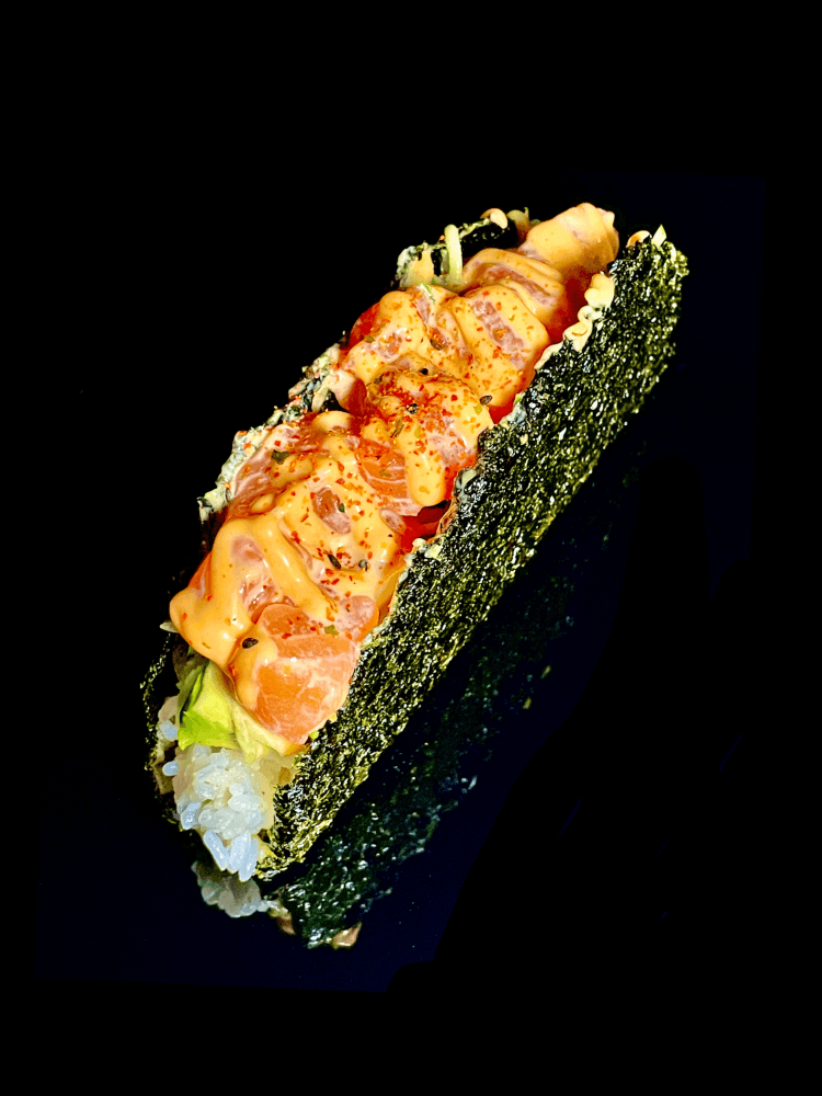 Fresh Salmon with avocado, cucumber, spicy mayonnaise, dried onions, sesame seeds