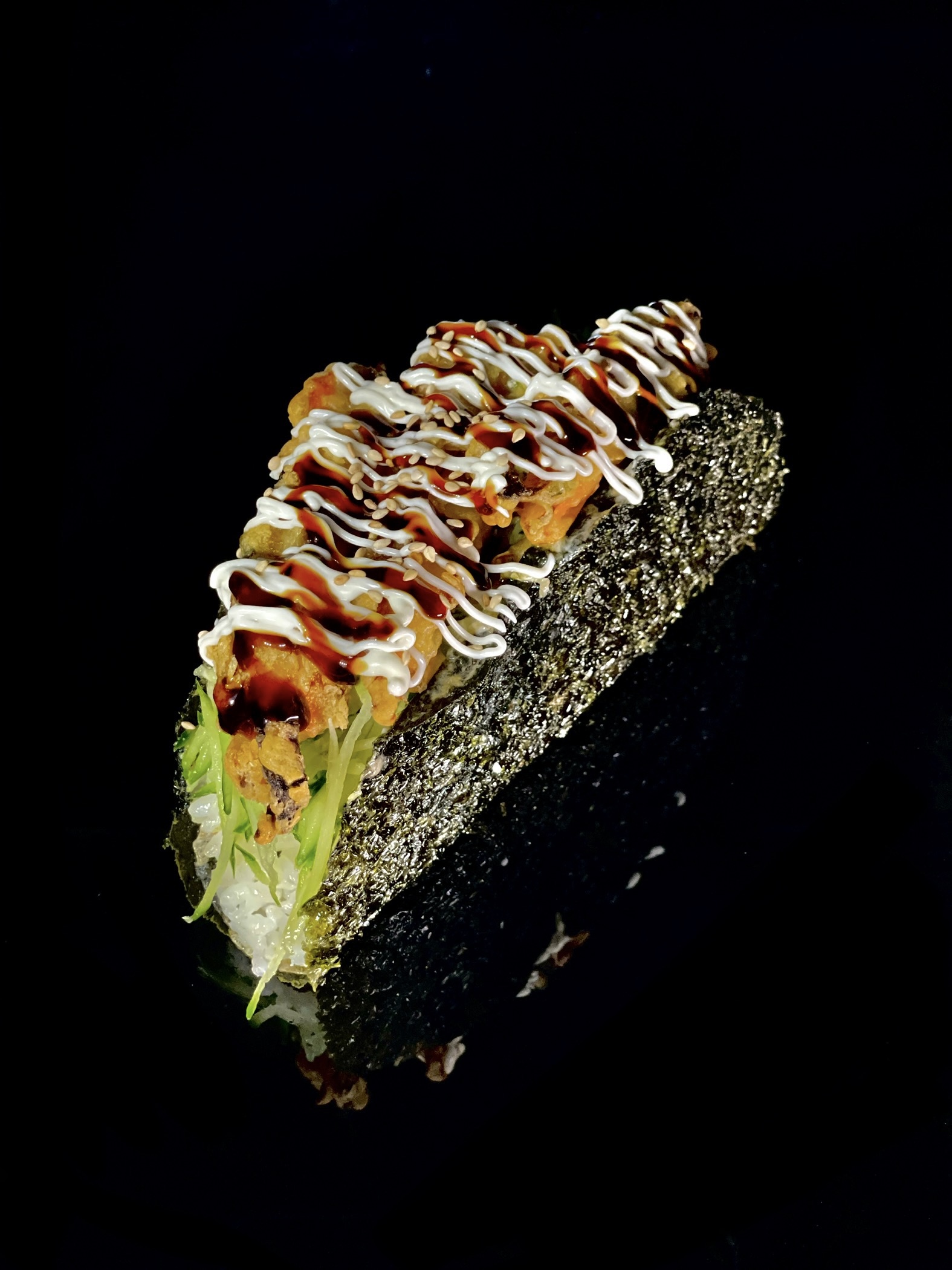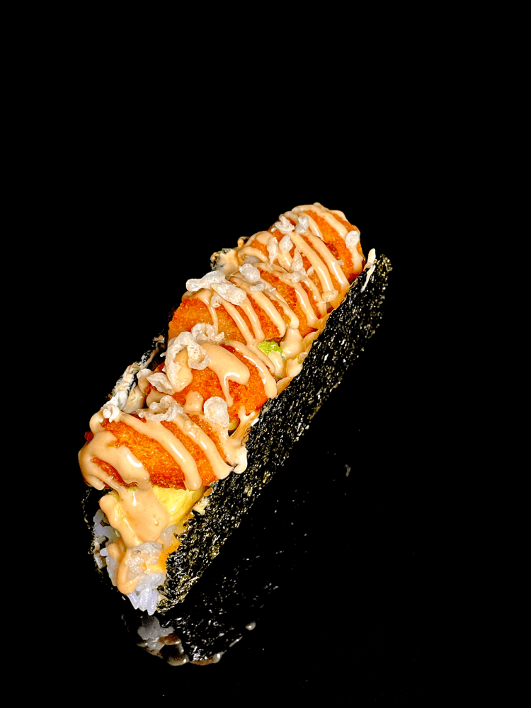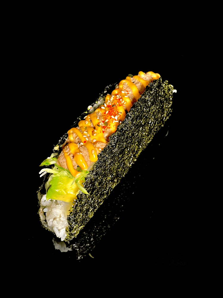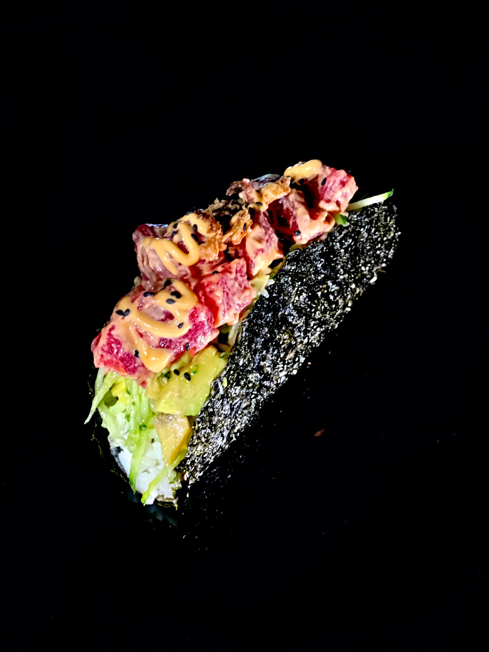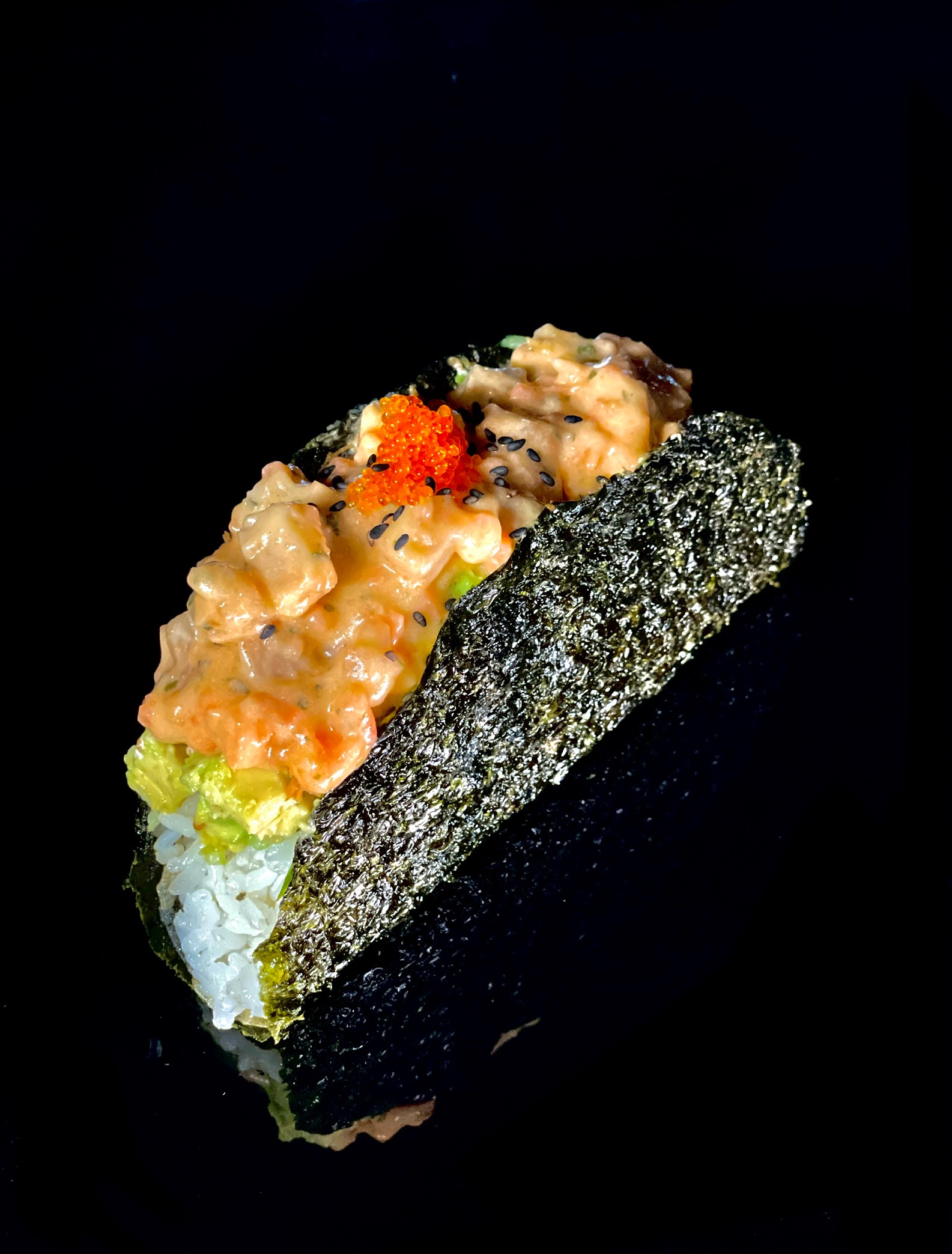 Fresh tuna with avocado, cucumber, spicy mayonnaise, dried onions, sesame seeds