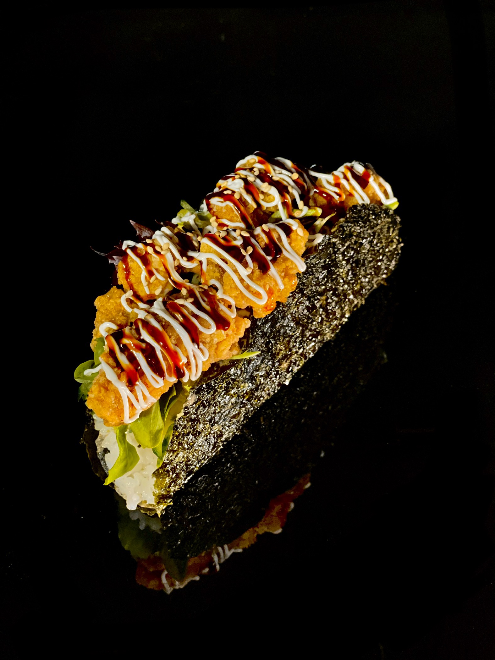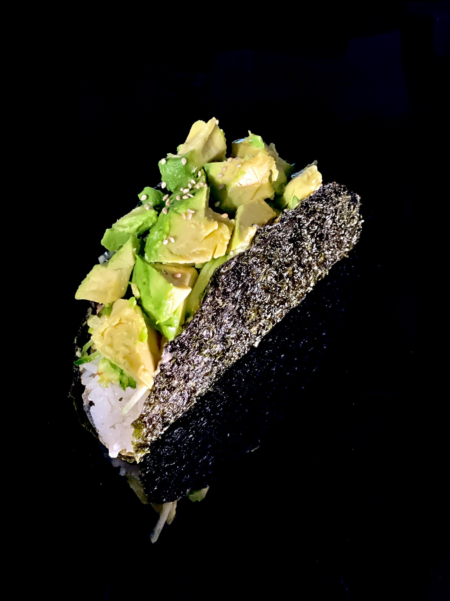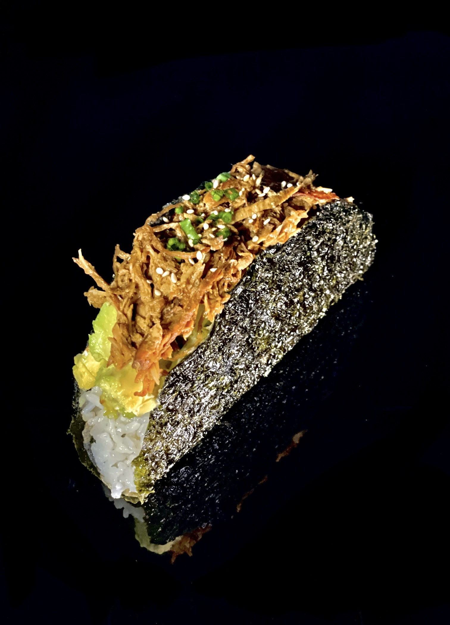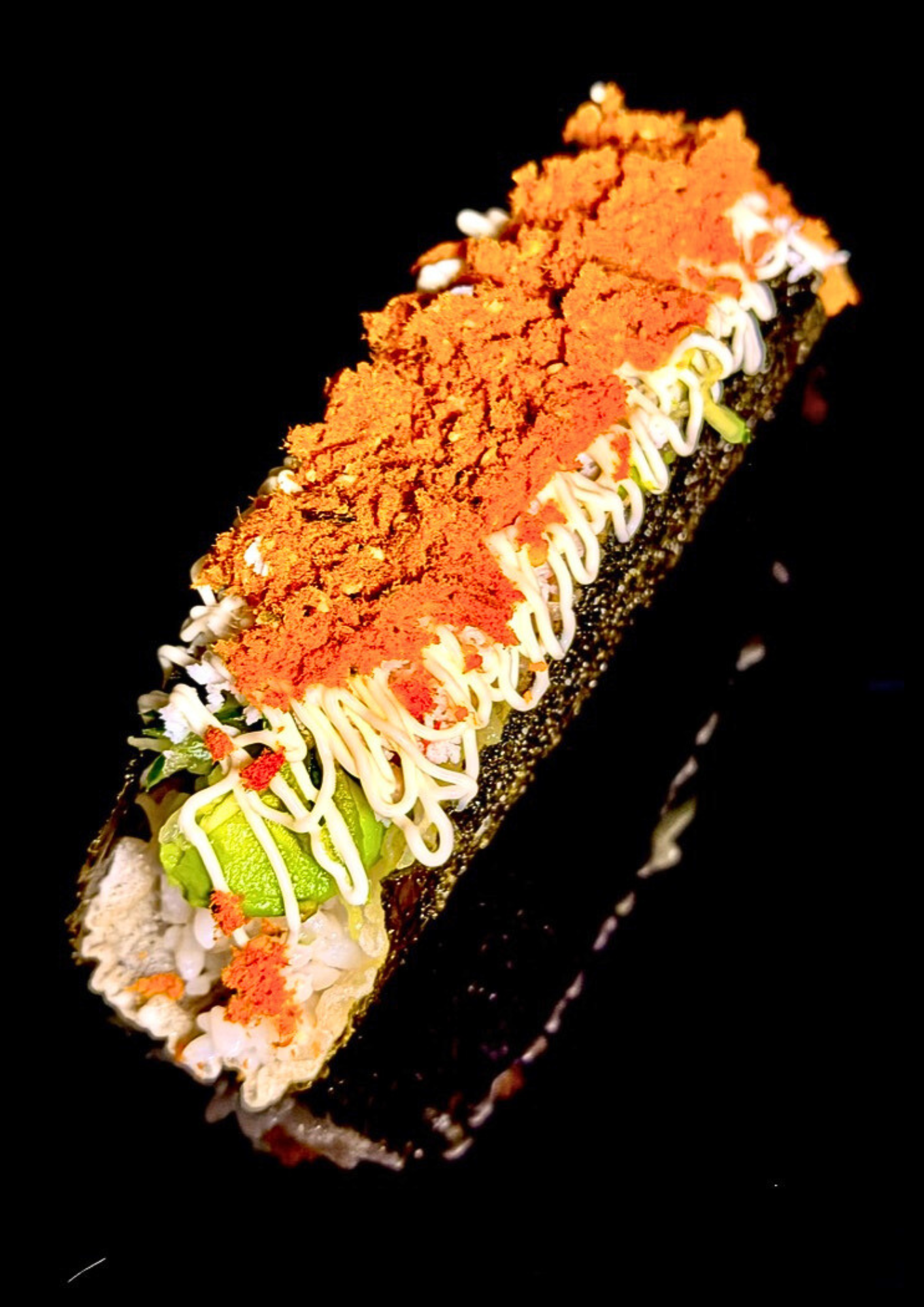 Fresh tuna with avocado, cucumber, spicy mayonnaise, dried onions, sesame seeds