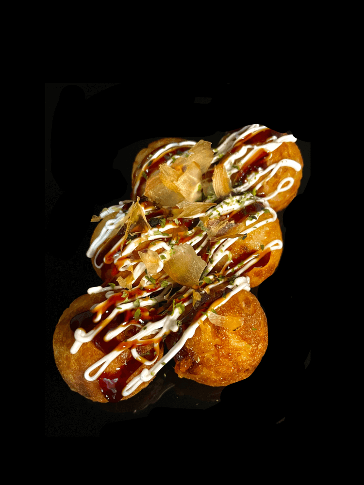 Deep fried octopus fish ball with mayonnaise, teriyaki sauce, nori powder, bonito flakes
