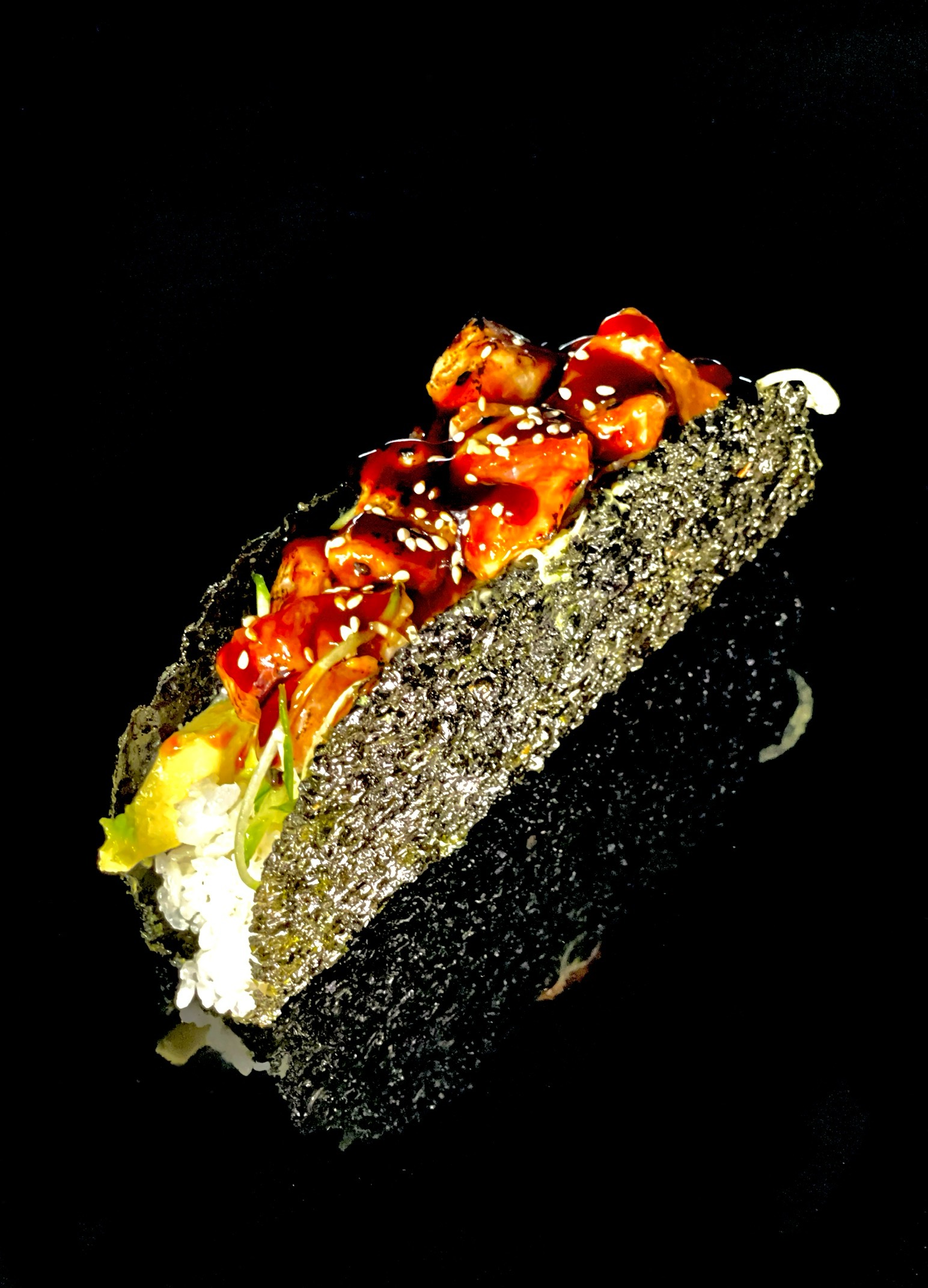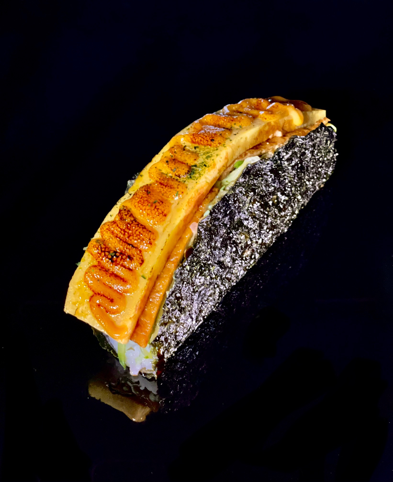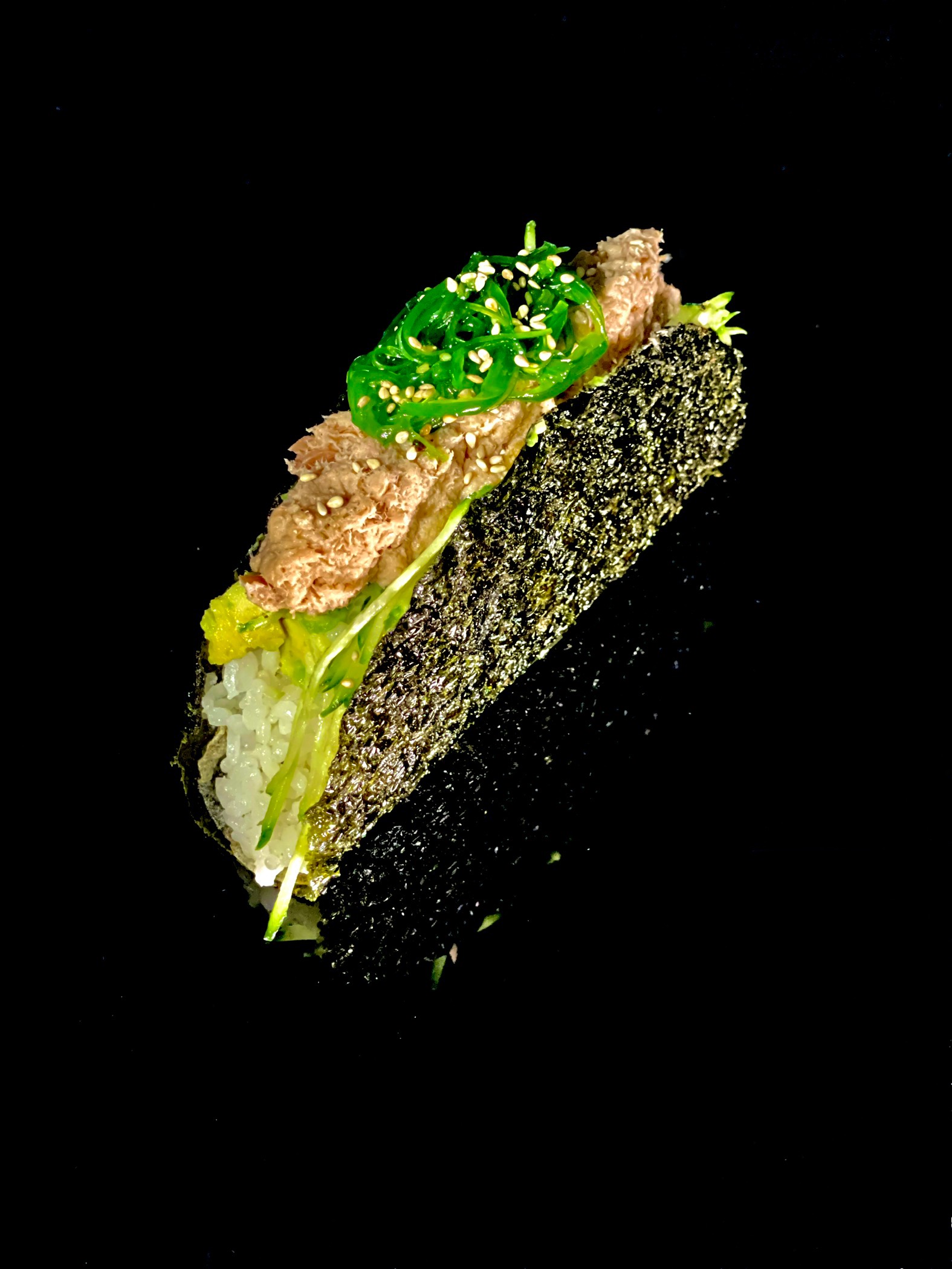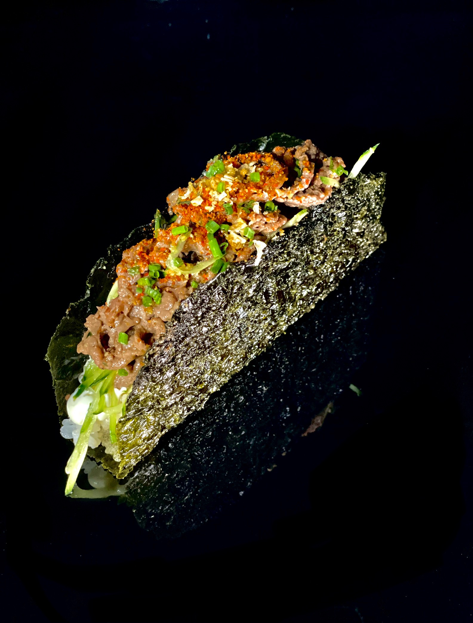 Grilled beef, cucumber, mayonnaise, dried galic, chivas, shichimi