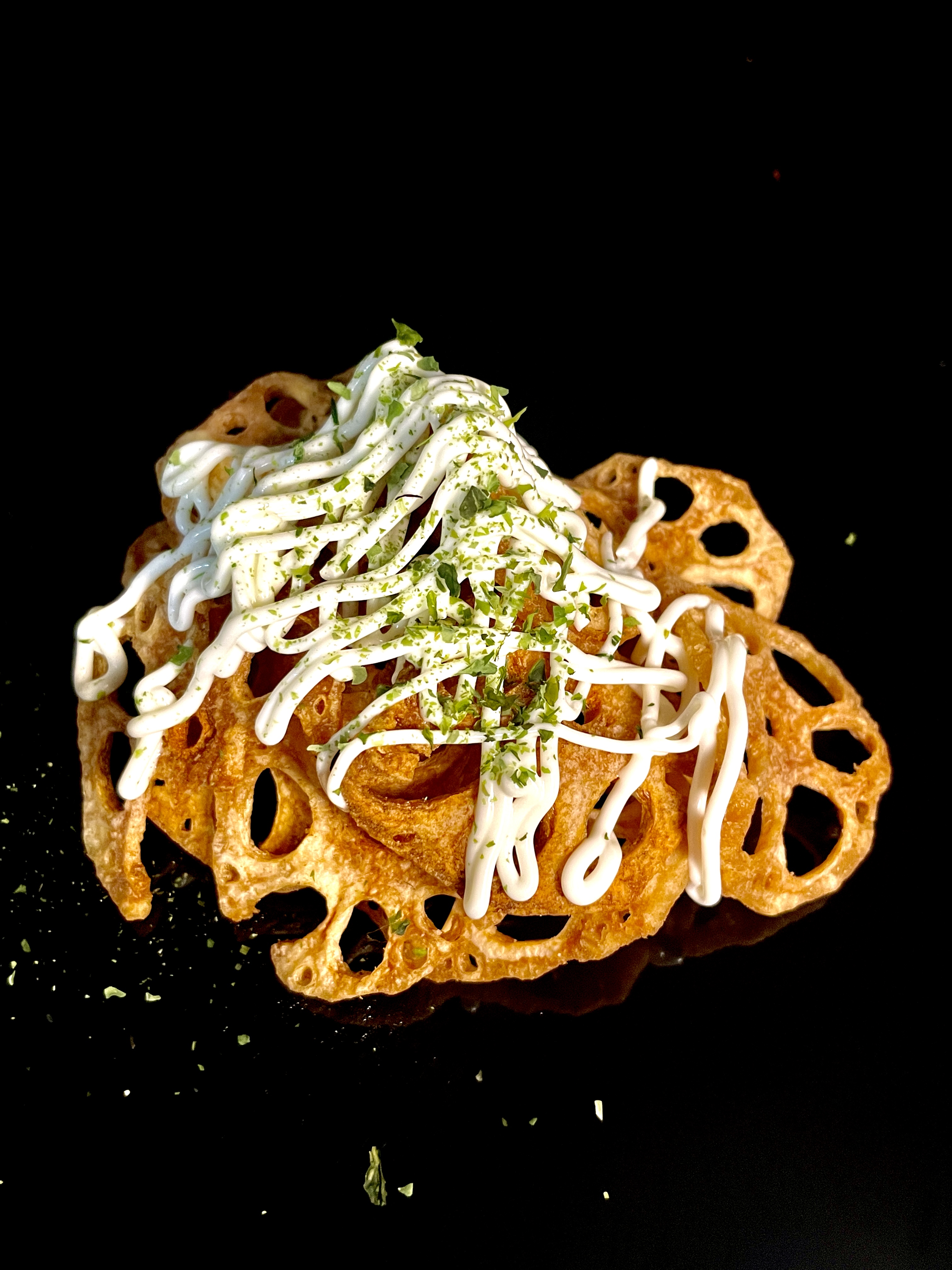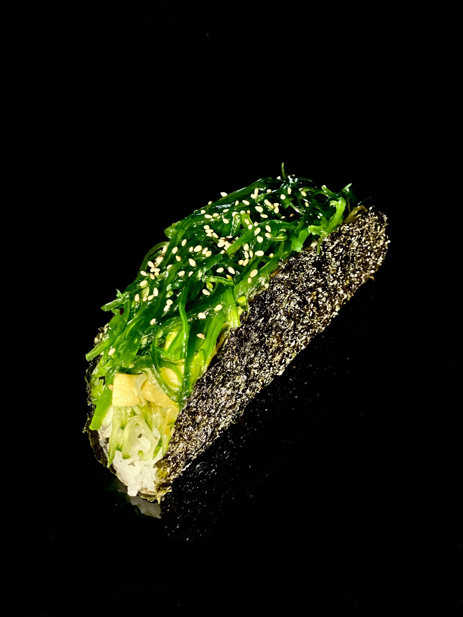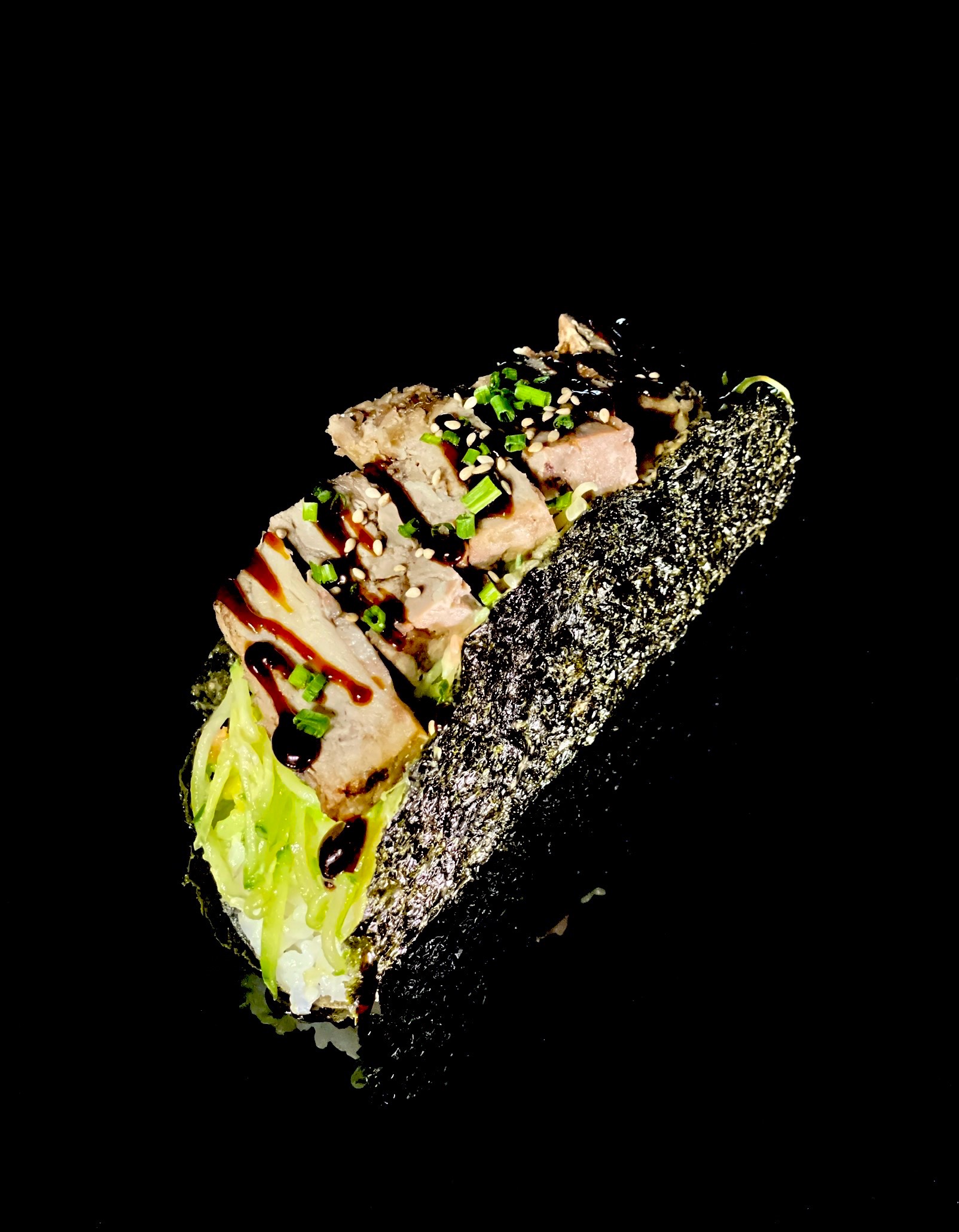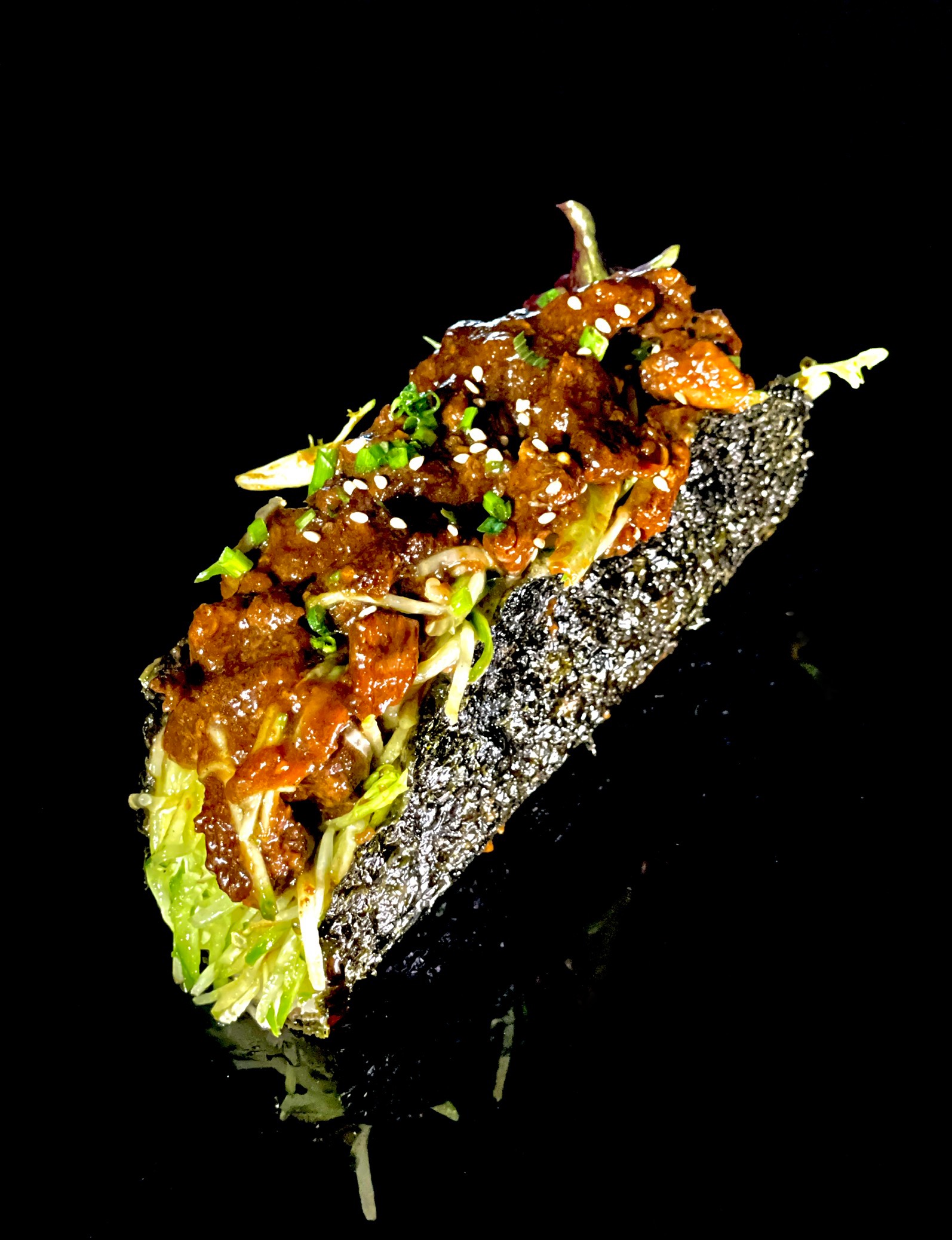 Grilled beef, cucumber, mayonnaise, dried galic, chivas, shichimi