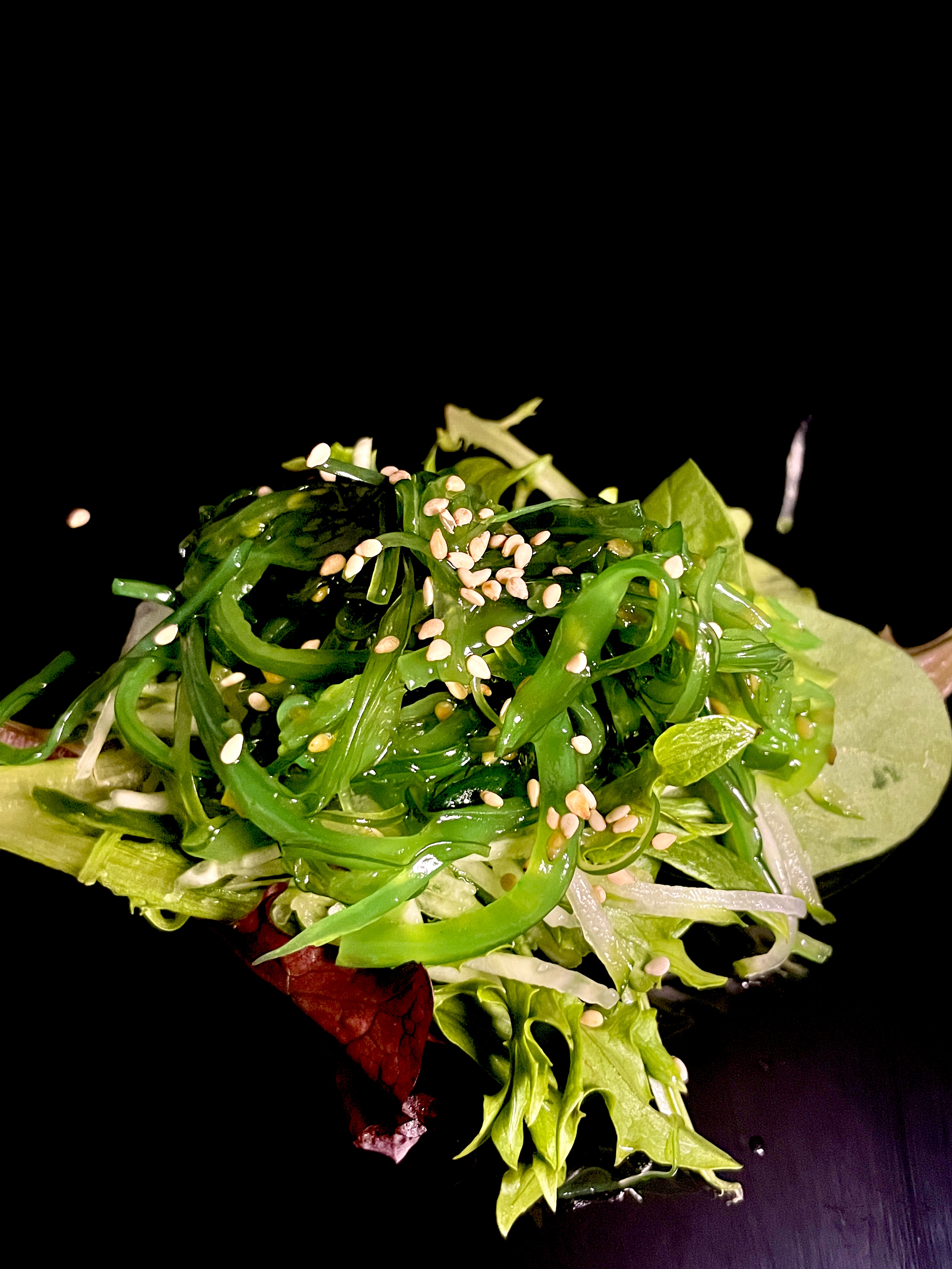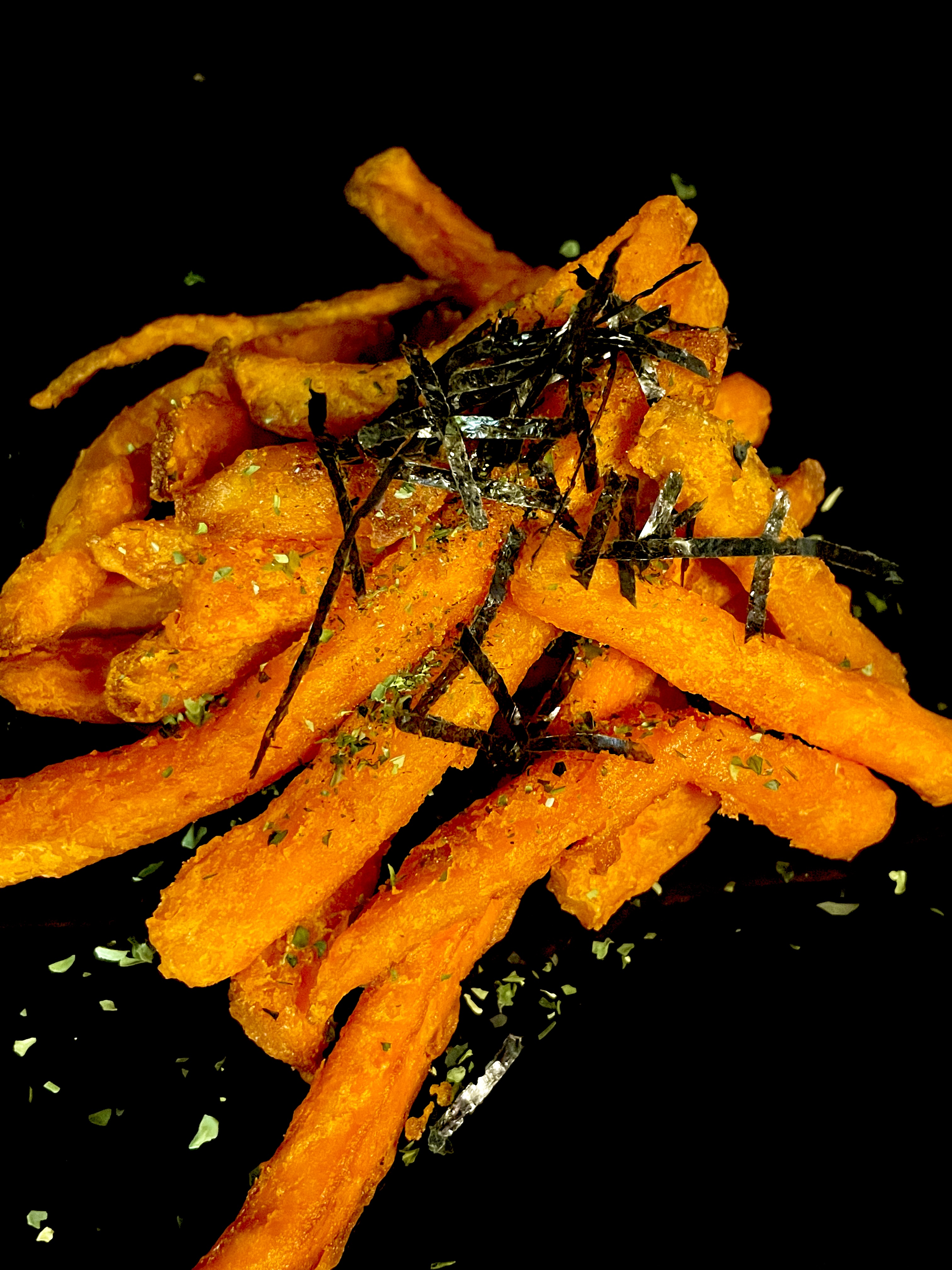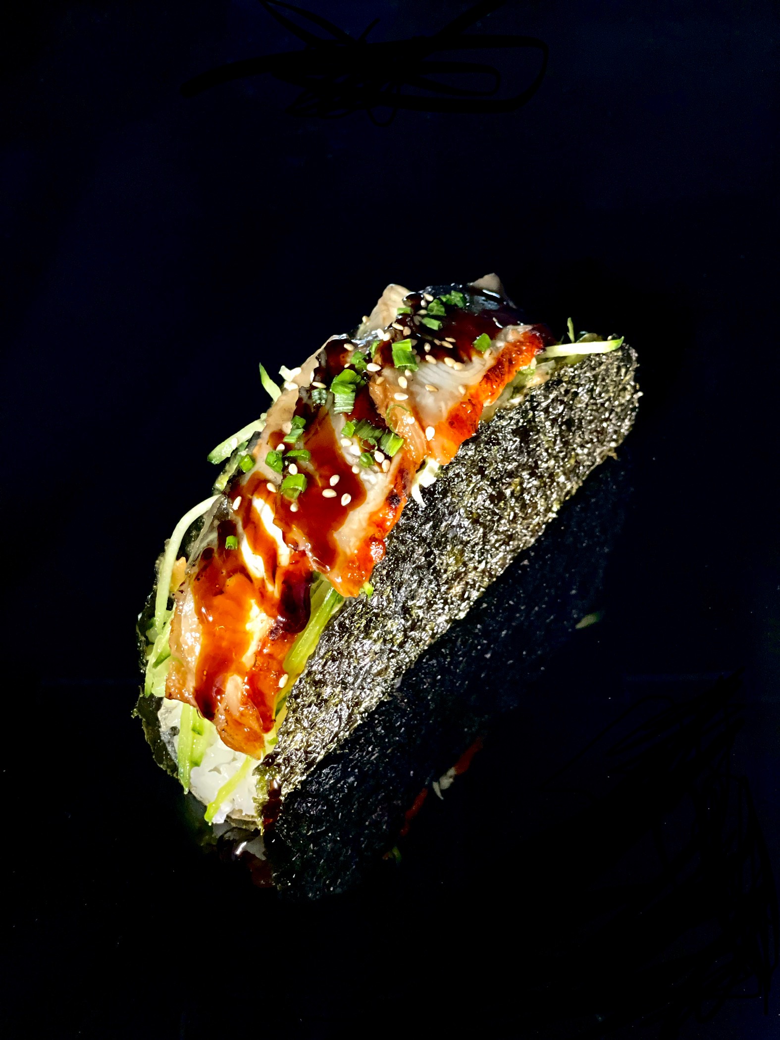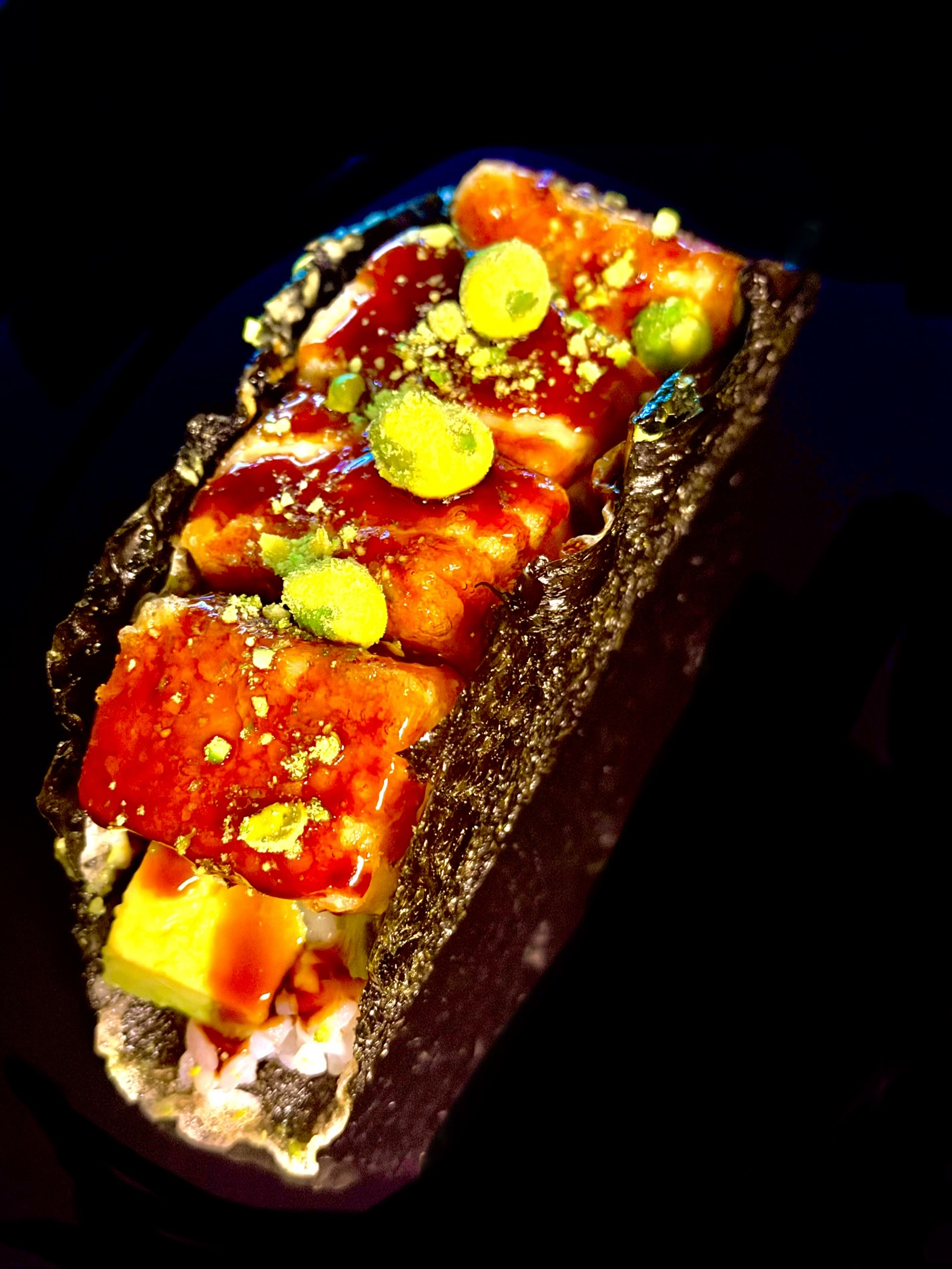 Grilled beef, cucumber, mayonnaise, dried galic, chivas, shichimi