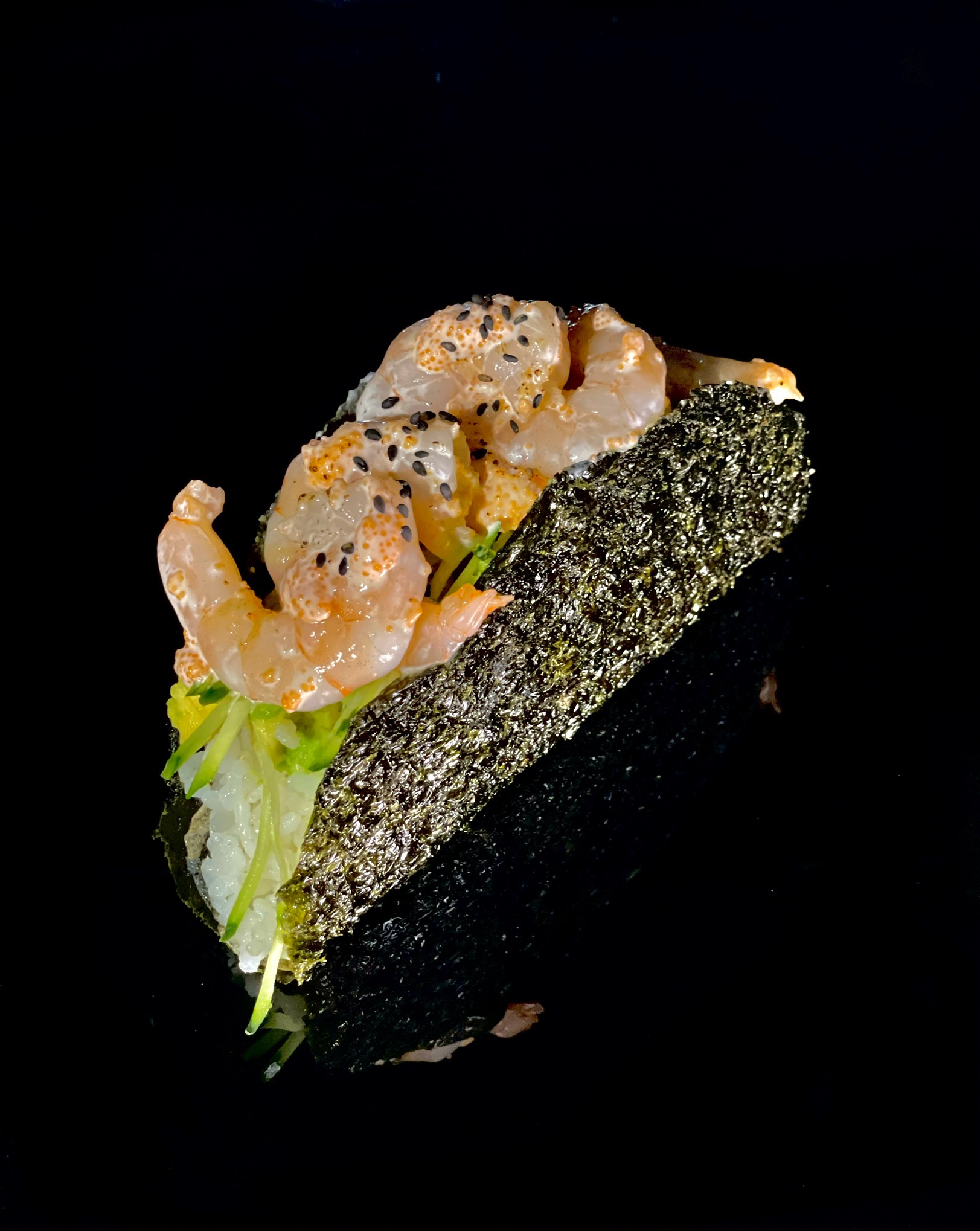 Grilled Prawn with mentaiko mayo, avocado, cucumber, and black sesame seeds